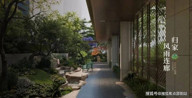 风雨连廊的链接,如一条串联绿城生活的珍珠项链,在“流光溢彩”的氛围中,将绿植水景、休憩平台一一相连,塑造移步异景的立体生态廊道。