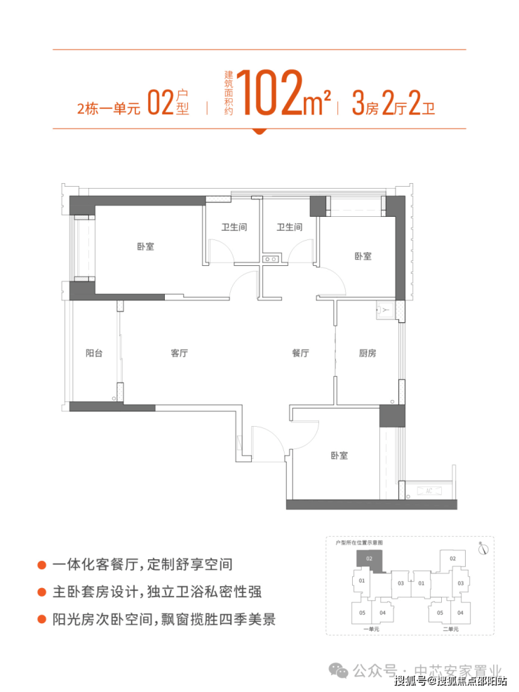 户型:建筑面积约88-103㎡,涵盖3房2厅1卫至4房2厅2卫,主力户型为88㎡、96㎡、99㎡、102㎡。