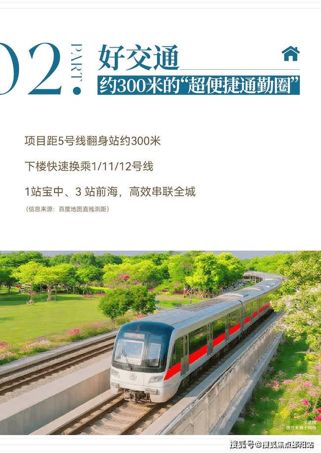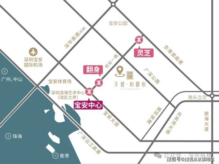 在交通出行方面,天健和郡府距离地铁5号线翻身站B出口仅约300米,步行约5分钟即可进站,1站直达宝安中心、3站抵达前海湾枢纽,可便捷换乘1号线、11号线、12号线通达南山科技园、福田CBD等核心区域;距宝安国际机场约14km,穗深城际铁路(机场-前海段预计2026年开通)进一步强化湾区连通-8。周边创业一路、广深公路等城市主动脉交织成网,约15分钟车程可通达前海、宝中核心区,真正实现了“轨道+自驾”的双重高效通勤-6。