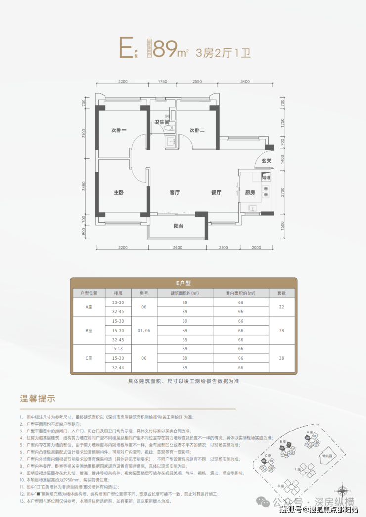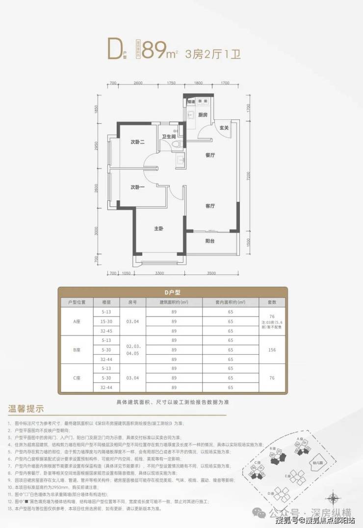 本项目规划建设住房1094套,其中回迁住房398套,分别位于1栋D座、1栋E座;无偿移交政府住房89套,分别位于1栋A座01房(5-13层、15-30层、32-45层,共39套)、06房(5-13层、15-17层,共12套),1栋C座01房(5-13层、15-30层、32-44层,共38套);本次面向人才配售的住房共598套(建筑面积约69㎡两房152套,建筑面积约89㎡三房446套),分别位于1栋A座、1栋B座、1栋C座;剩余9套住房本次暂不配售,分别位于1栋A座02房(5-6层)、03房(5-6层)、06房(18-22层)。