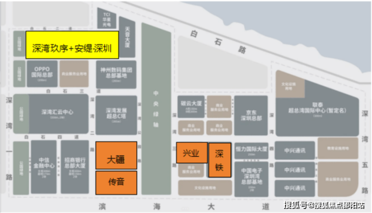 作为深圳唯一以“超级”命名的总部基地,深超总规划定位极高。吸引了众多世界级名企入驻,形成了以“总部 + 文化 + 生态” 为核心的复合功能布局。