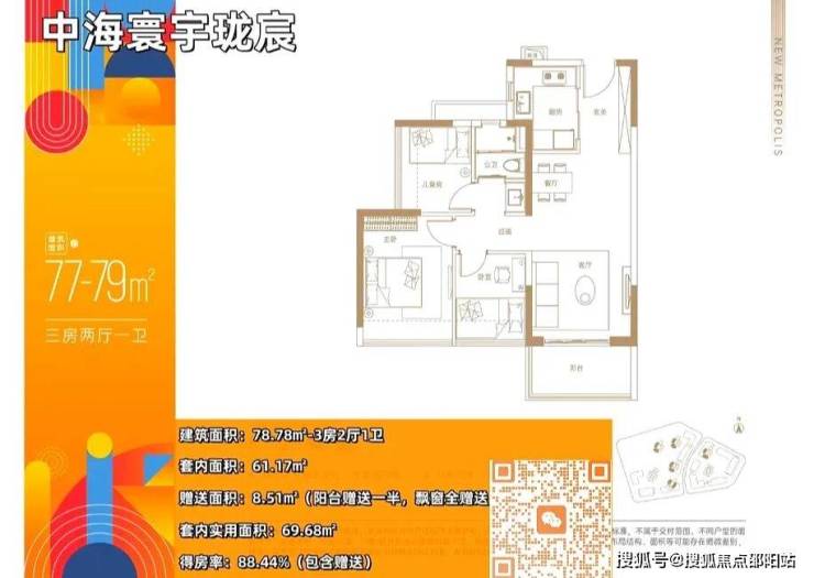 79㎡的3房2厅1卫,价格235-240万左右。设计的是经典竖厅格局,动静分区,客厅3.3米开间,餐客厅一体化,U型厨房,卫生间三段式分离设计,得房率:88.44%(包含赠送),有西南、东南、西北朝向。深圳中海寰宇珑宸售楼处电话☎:400-992-6967✔✔✔