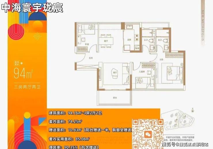 94㎡的3房2厅2卫(07户型),设计的是竖厅南北通透格局,客厅3.7米开间,三开间朝南,全屋飘窗设计,U型厨房,得房率:90.35%(包含赠送),阳台主朝东南向。深圳中海寰宇珑宸售楼处电话☎:400-992-6967✔✔✔