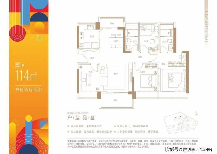 114㎡的4房2厅2卫,设计的是竖厅南北通透格局,双阳台设计,客厅3.9米开间,四开间朝南,全屋飘窗设计,U型厨房,得房率:90.74%(包含赠送),大阳台主朝东南向。
