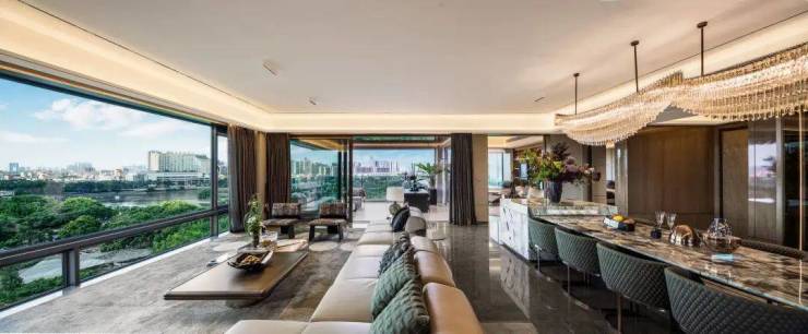 这里,可以是气场十足的待客主场。交谈之余,和客人同立于落地窗前,看东江缓缓流过,笑谈风云;亦可以举办家族私宴,共享温馨时光。当空间无限放大,视野无界开阔,生活中的一切也变得更加自由与美好。