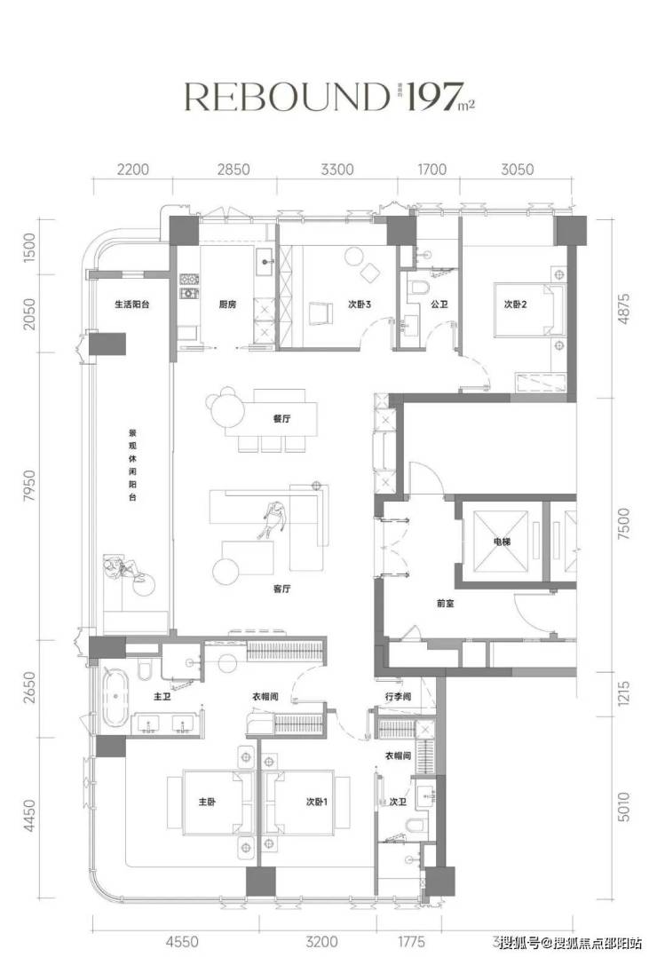 • 尺度革新:建面约197m²户型,专梯入户设计。户型格局极致方正,动静分区清晰,实现了三面采光与双南向套房的“双龙抱珠”格局。