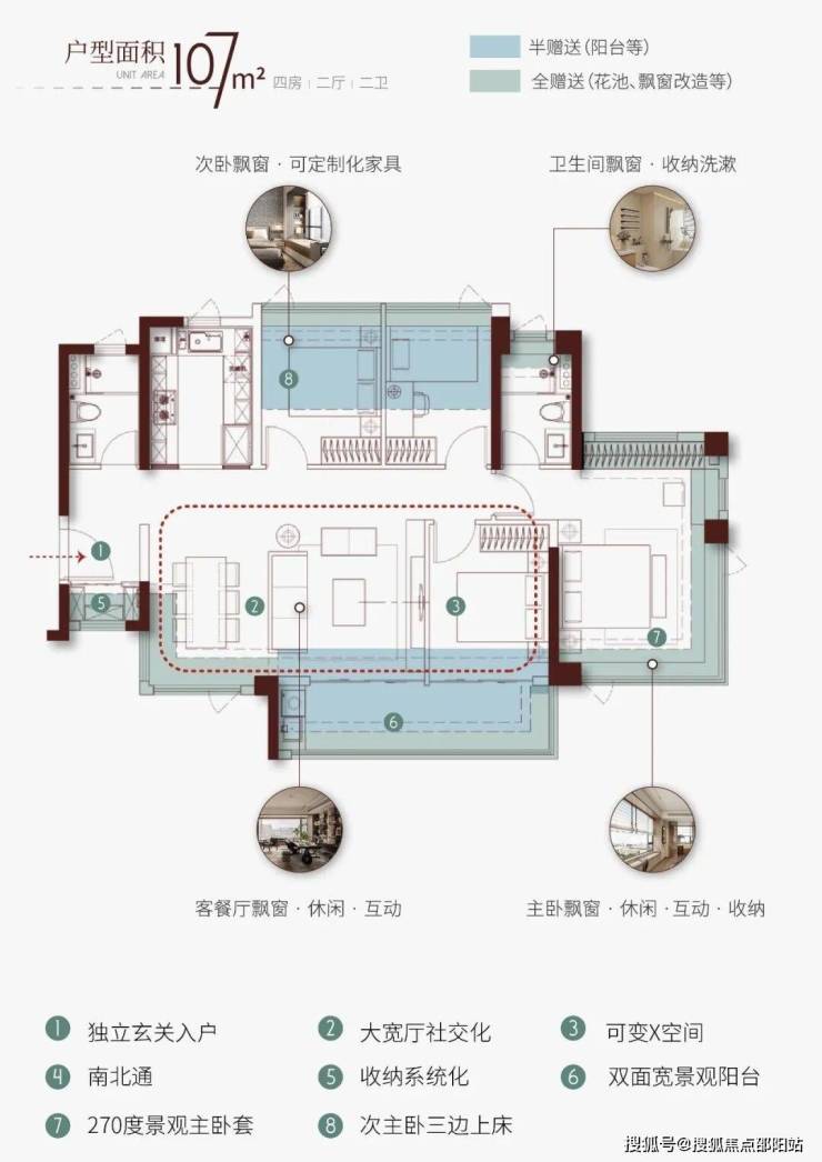 4.5开间朝南提升舒适度。全天候自然通风设计。中心化餐厅+灵活X空间,拓展生活场景。270度观景主卧套诠释精致生活,套房化设计强化舒适感。