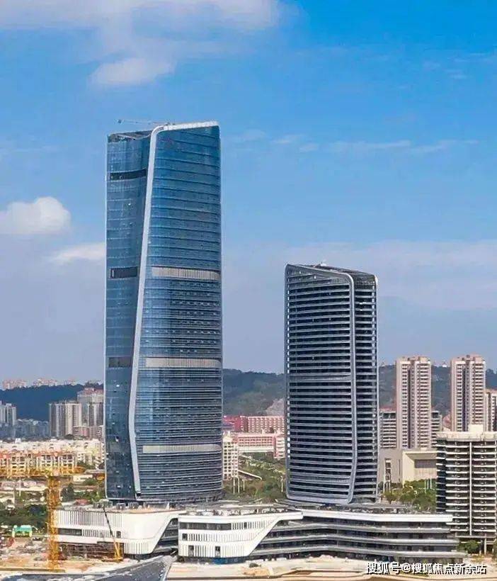 目前,“双子塔”外立面的玻璃幕墙也已基本全部拼装完成,天蓝色的玻璃幕墙与天空的蓝色交相辉映,充满现代感和时尚感。