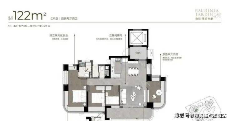 双龙抱珠户型,其中一间次卧位于客厅另一侧,双面采光,靠近动区,适合作为老人房或书房。客餐厅南北通透,兼顾横厅与竖厅优点,空间感足,利用率高,动静分离、干湿分离设计合理。贯通式超长宽境阳台,采光舒适度高。