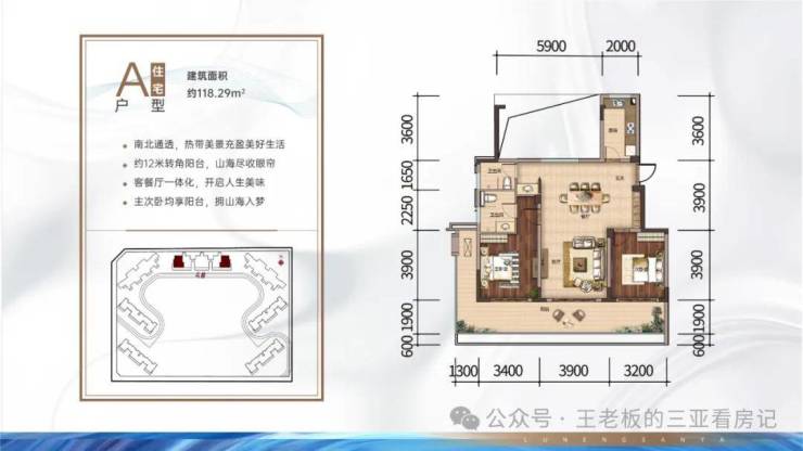 A户型:约118㎡2房2厅2卫(幻变4房),延展后可使用面积约155平米,南北双阳台