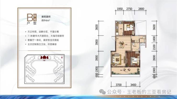 B户型:约95㎡2房2厅2卫(幻变3房),延展后可使用面积约118平米,南北双阳台