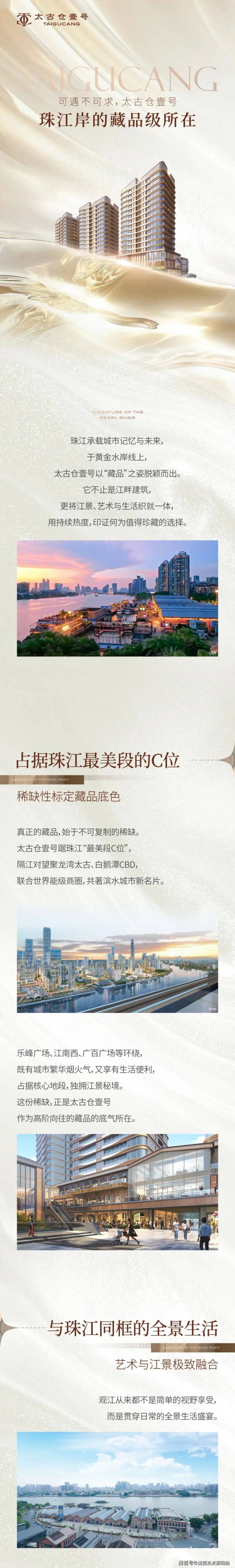 太古仓壹号坐拥传统老中轴延伸优势,串联白鹅潭商务区、聚龙湾综合体和太古仓等城市新人文地标,琶洲、白鹅潭、广钢、广纸等四大繁华商圈环绕,传统与现代兼文商旅圈,形成"水陆双循环"的顶级商圈格局。隔江对望聚龙湾太古、白鹅潭CBD,人文与艺术交相辉映,孕育全球前沿水岸生活的世界橱窗。