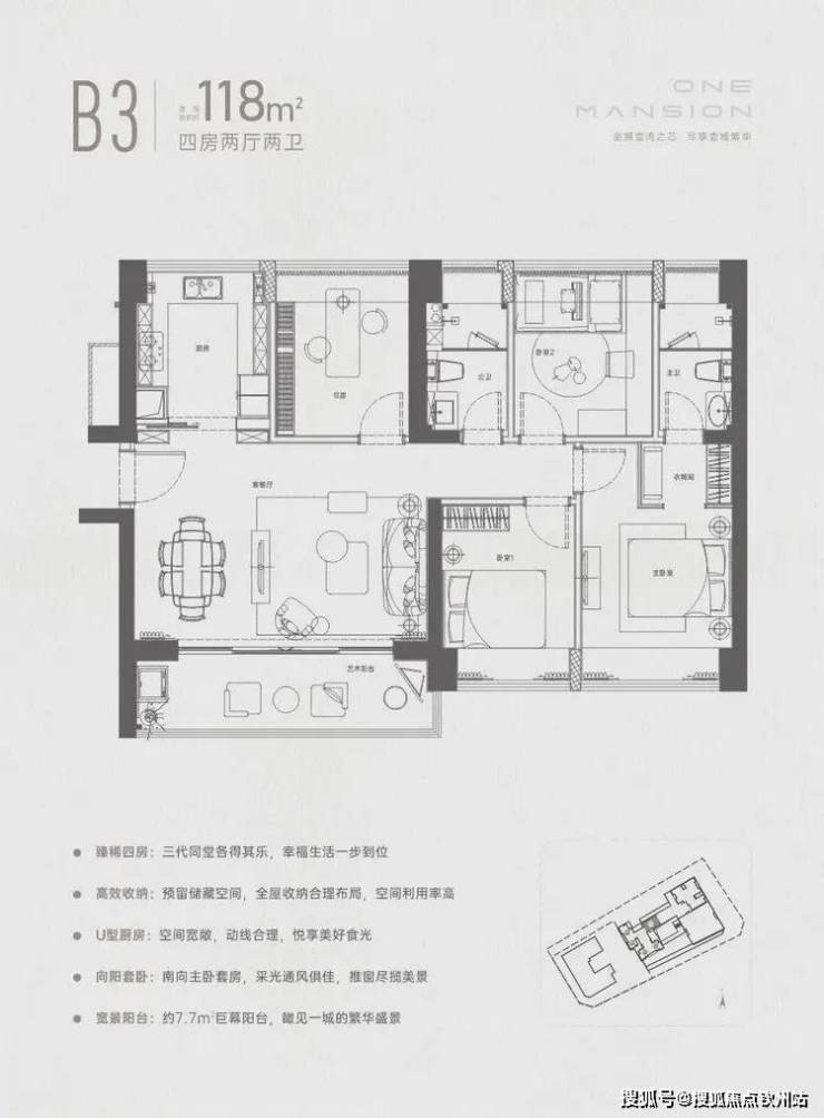 设计的横厅南北通透格局,客餐厅4.2米开间,全屋飘窗设计,四开间朝南,4个卧室分别做到了3.2米/2.9米/2.9米/2.7米的宽度,U型厨房,约7.7米长超大阳台,得房率72.47%(不含赠送),阳台主朝东南向。