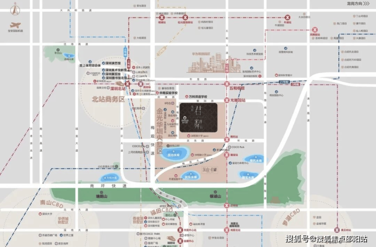 ①双枢纽(深圳北站+五和站),1小时无缝对接大湾区;五和站城际枢纽,5/10号线及规划中的深大、深惠、深广中轴城际。