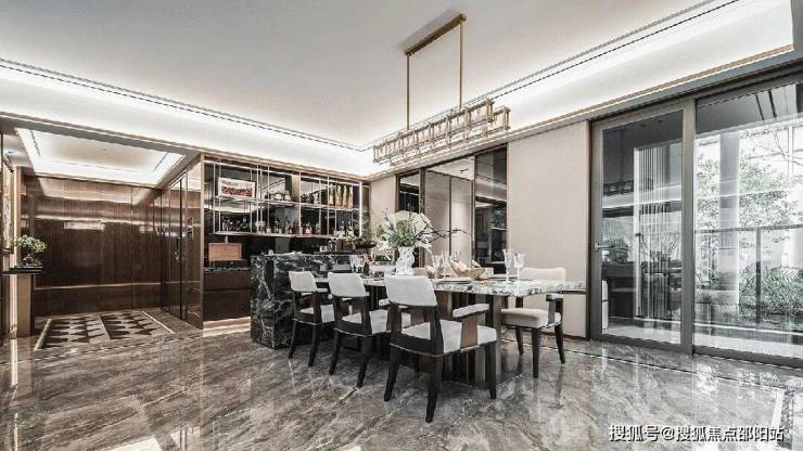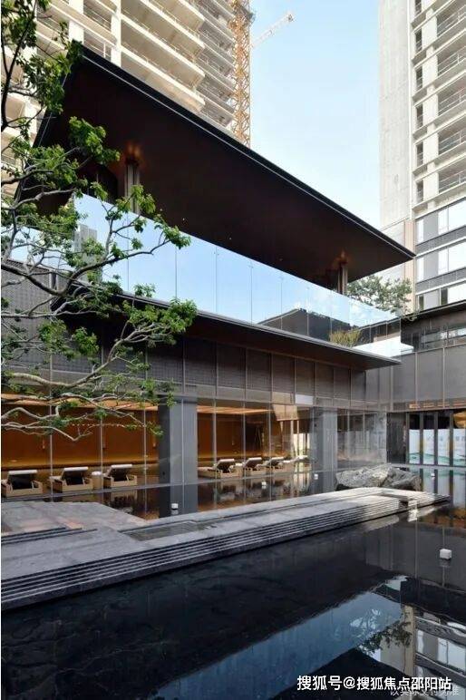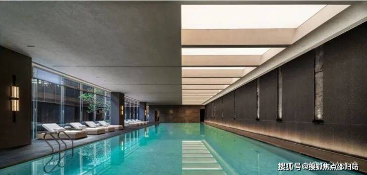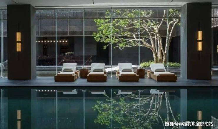 围绕下沉庭院展开恒温泳池、休闲水吧、私宴厅等功能空间。恒温泳池紧邻下沉庭院,大面积落地窗设计打通了室内外的视野,不仅提供大量的自然光,也让空间更为通透,形成了人居空间与自然空间的流动关系。
