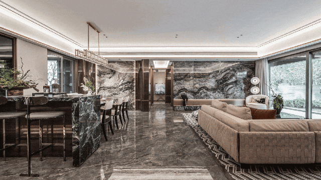 再比如,客厅选用肌理天然的岩板,高级又不乏自然质感;地面采用无感高差设计,一是居住更舒适,更重要的是,减少家中的老人孩子发生安全事故的可能性;全屋卧室都是通高隐藏门设计,室内更整体,看起来更开阔。