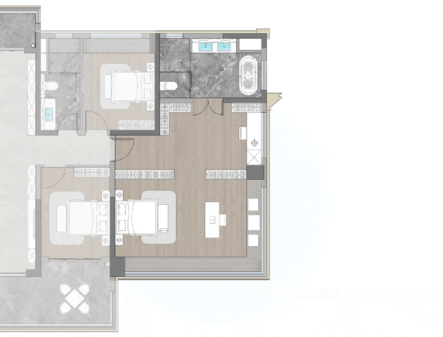 同时设计还采用了 “边厅式”设计,让业主可享有270°大采光面+超广角视野带来的沉浸式居住体验;同时卧室内还有个“X”空间,可根据个性化需求定制为行政书房、收藏间等场景。