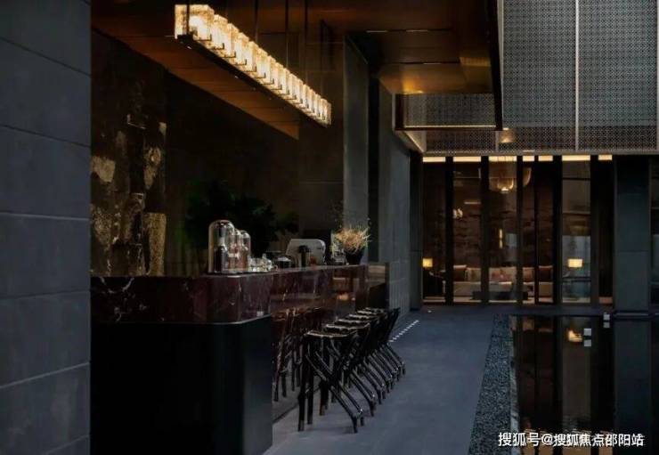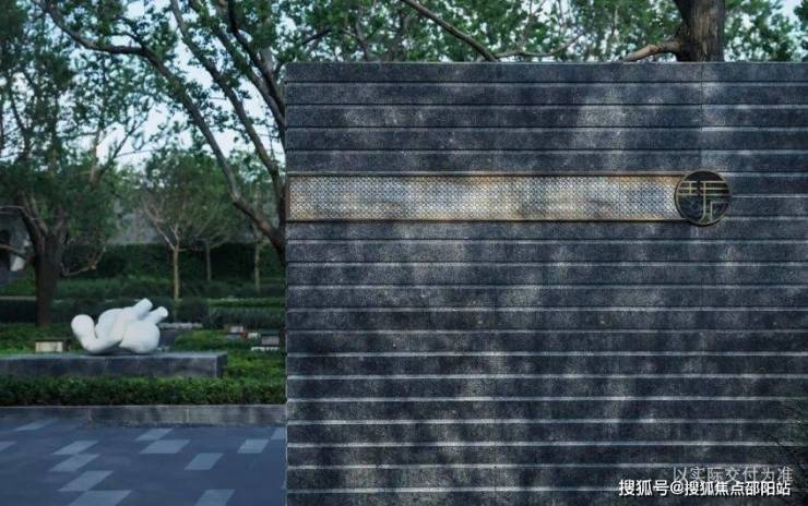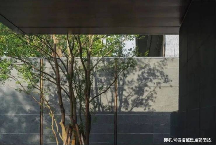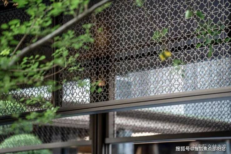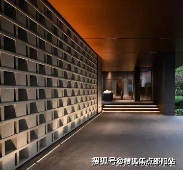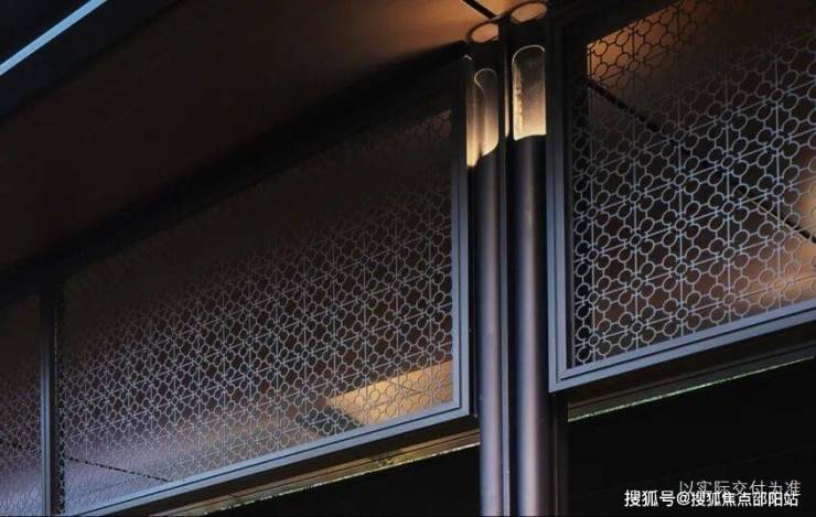 镂空文化砖墙:入口对景墙采用了灰色泥客石材质的镂空文化砖墙处理方式,所形成的光影效果与半透半隐的暧昧氛围,用传统建筑中的“半透明”来营造隐奢的空间气质。