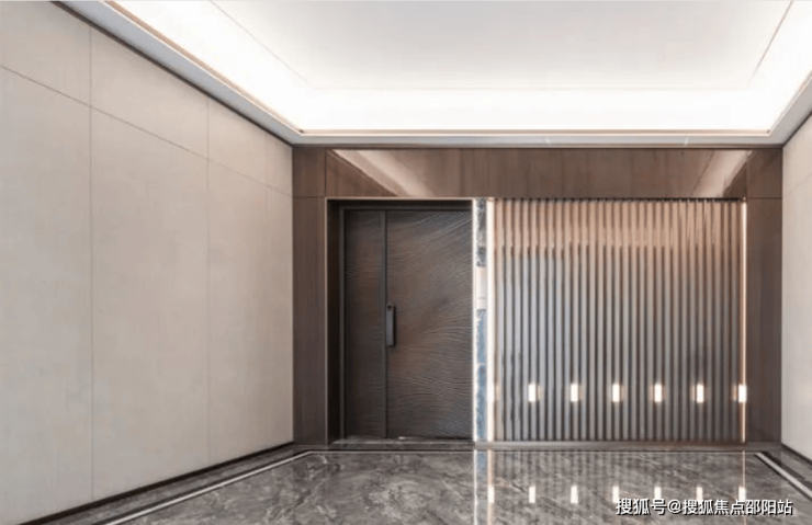 比如,采用超高品质的铸铝入户门,质感非常厚重。一体化的标识灯光,入口侧还设计有天然石材+定制门牌标识体系,处处彰显细节与氛围,门也变成了一件“艺术品”。