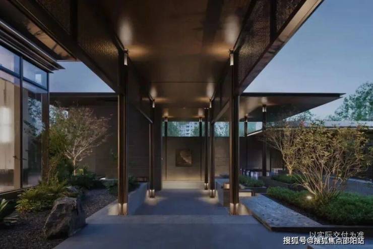 置身于连廊中,俯视中心水院,高处的景观尺度和感观则是另一种体验,用广角来感受清澜水院的纯粹和优雅禅意,两侧灯具细节更显天珺隐奢格调。