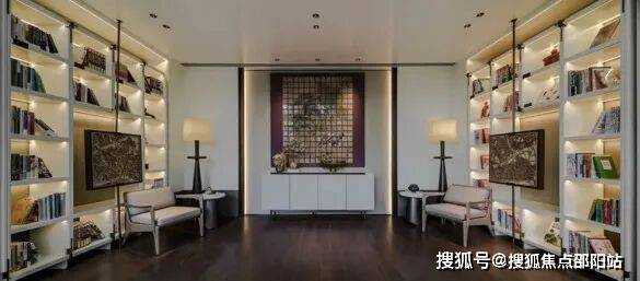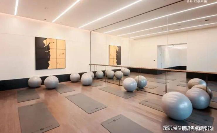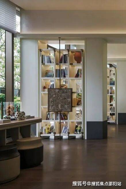 游至一楼架空层,在书吧区,丰富的藏书搭配舒适沙发,提供休闲惬意的阅读享受,在瑜伽室,通过落地窗的设计,引入大量的自然采光与景观,随时能让业主完成一次身体与心灵的和解。