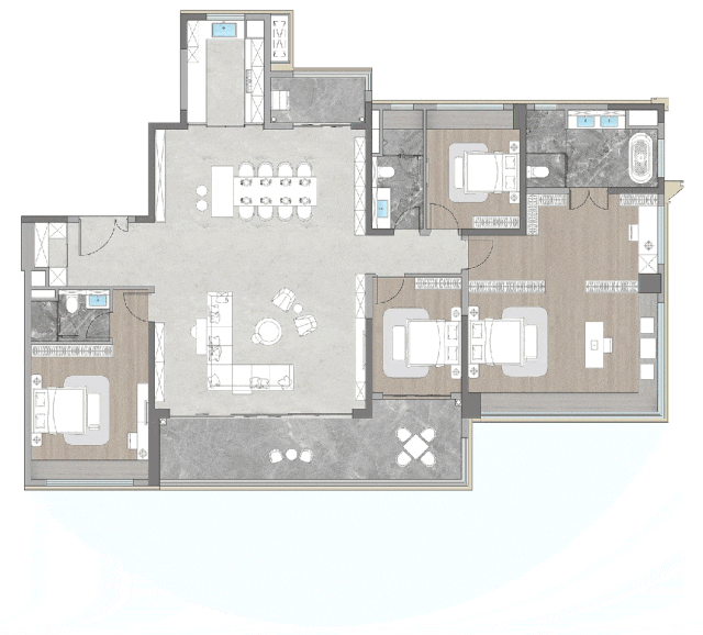 通过户型结构优化,灯湖天珺项目为家庭场景提供了更多可能性,室内公区LDKB开合自由,无论身在任何一处,都可以随时与家人互动,彼此都处在一个可以“被看见”的空间里,提升了情感浓度。
