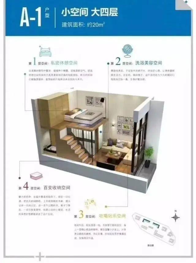 A-1户型品鉴:3.6米层高,单面采光,上下分层布局合理,收纳、起居、空间相对独立。较高的采光高度,足以满足室内自然光线的明亮,小阳台也可完全满足日常外界接触空间和晾晒的需求。
