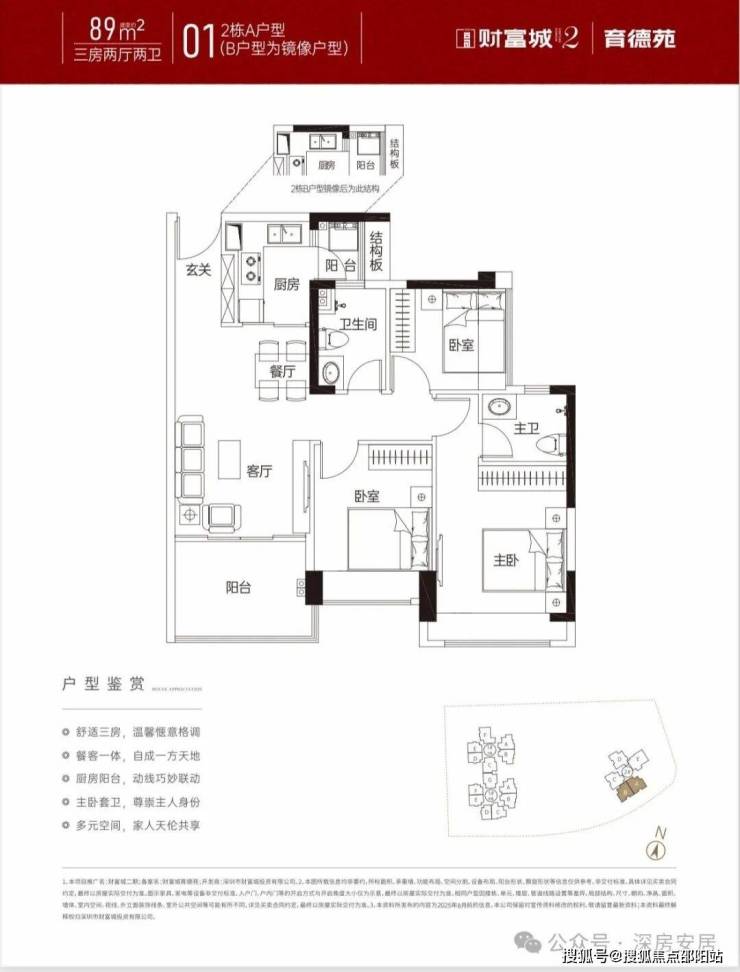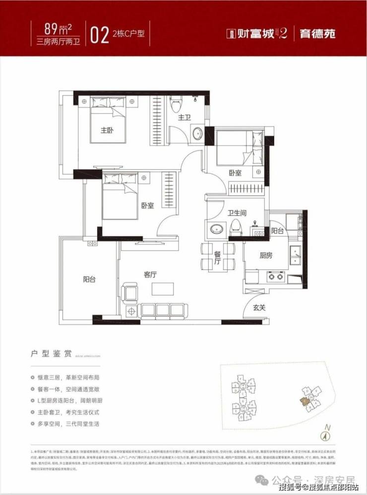 84㎡的3房2厅1卫,A户型,设计的是经典竖厅格局,客厅3.4米开间,LDKB一体化设计,动静分区,L型厨房还带1个生活阳台,卫生间三段式干湿分离,得房率约79%(不含赠送),东北朝向。