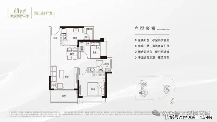 68㎡的2房2厅1卫,设计的是竖厅格局,客厅3.4米开间,LDKB一体化设计,动静分区,L型厨房带1个生活阳台,卫生间三段式干湿分离,得房率约79%(不含赠送),西南朝向。