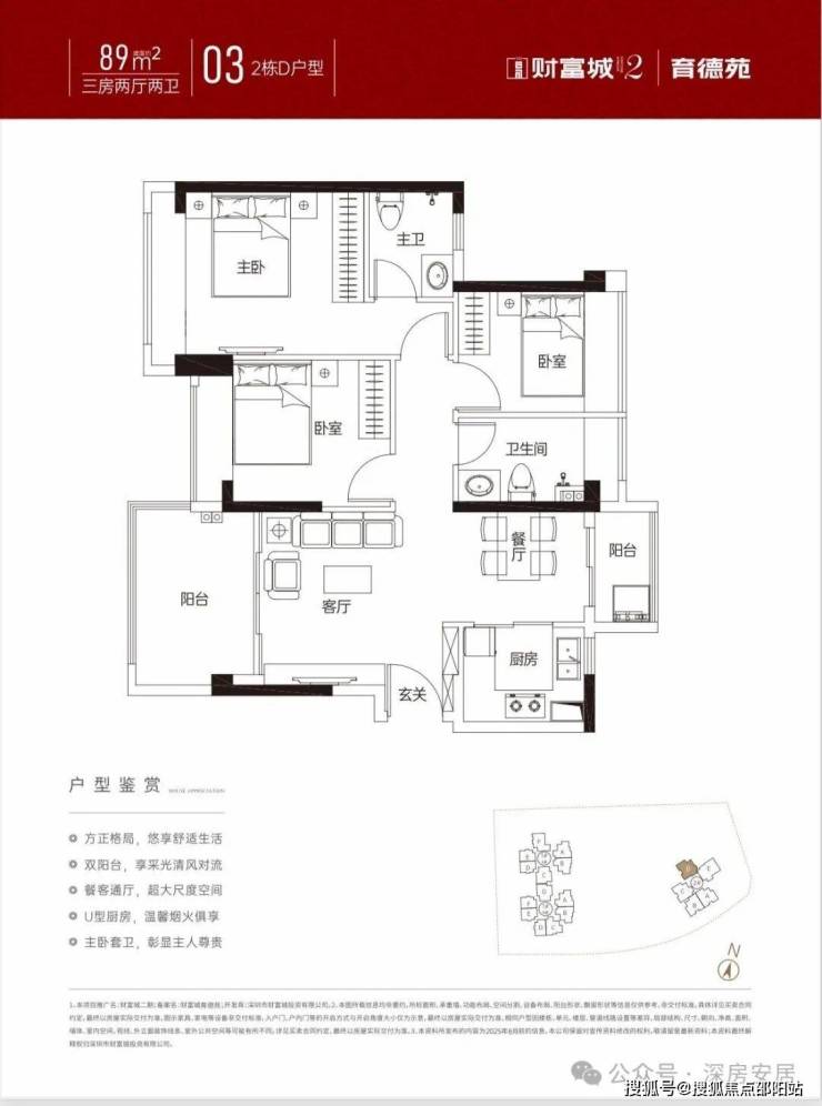 84㎡的3房2厅1卫,1栋A座C户型/1栋B座G户型,设计的是竖厅南北通透格局,客厅3.4米开间,客餐厅双阳台分离化设计,U型厨房,卫生间干湿分离,得房率约79%(不含赠送),客厅阳台主朝东北向。