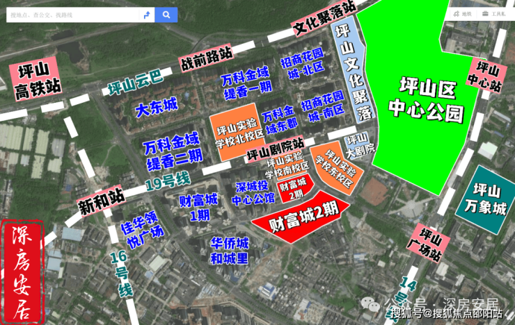 财富城2期,位于坪山区高铁新城金丰路与和安路交汇处西侧,地处坪山核心区域,是坪山区最顶流的居住区,像大东城、万科金域缇香、招商花园城、深城投中心公馆、财富城1期、和城里等楼盘都是位聚于此,这里也拥有最完善的市政配套,类似于坪山中心公园,坪山大剧院,坪山美术馆,坪山图书馆,坪山文化聚落,坪山区政府,坪山游泳馆等都在项目900米范围内。