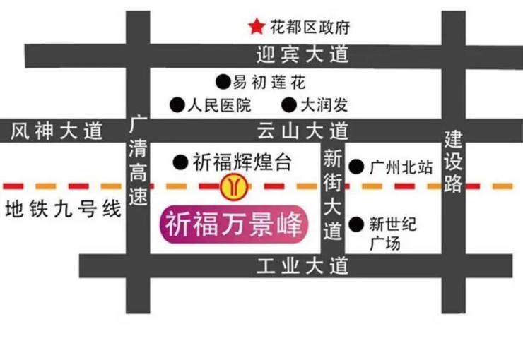 祈福万景峰位于花都区新华街繁华城区中心(新街大道),广州北站西侧,广清高速出口东侧,紧邻已开通的地铁9号线广州北地铁站A出口及规划中的地铁24号线,瞬达广州各区。
