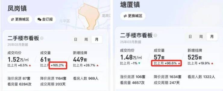 从贝壳网也能看出,凤岗3月二手成交大涨165.2%,塘厦3月二手成交大涨96.6%。
