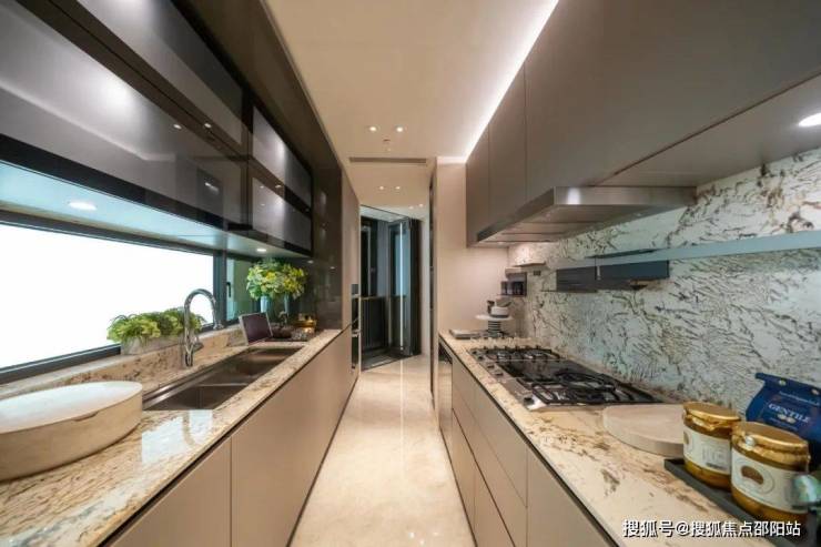 大门玄关旁为传统独立厨房。厨房以长形设计,备有双边工作枱面,提供充裕空间让住户整理食材。厨柜以云石枱面配上灰色柜门饰板,十分新潮。