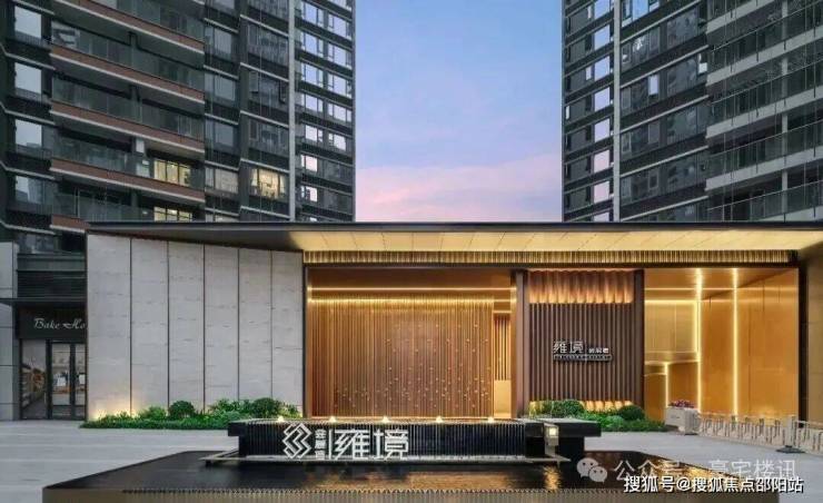 走近小区,约25米的主入口大门雍容大气,将石材、水景、铝格栅等元素巧妙结合,宛如星级酒店大门。