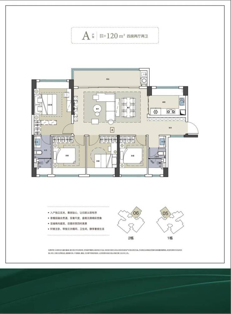 120㎡4房2卫户型,总价1080-1200万
