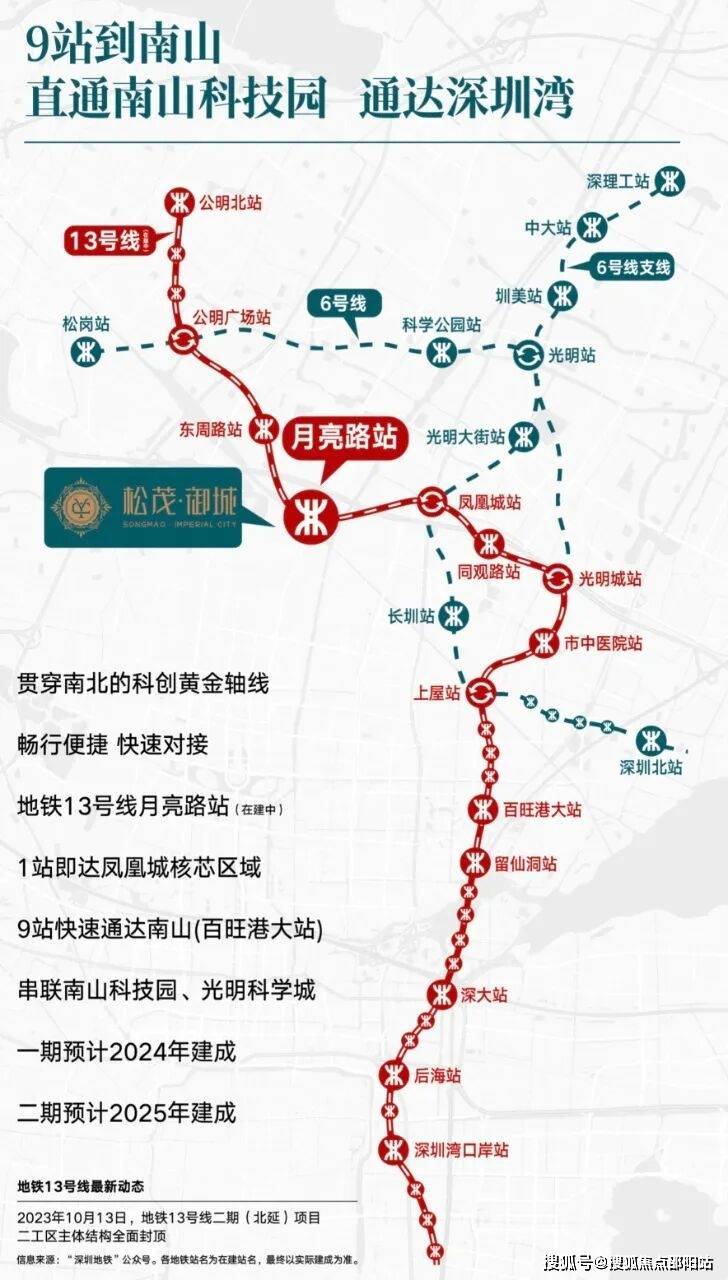 松茂御城紧挨着松白路主干道,周边还有东明大道,光明大道,沈海高速,深圳外环高速,南光高速,龙大高速等交通要道,目前距离在建的13号地铁线“月亮路站”约400米,3站到光明城站,5站到石岩上屋站,计划在2025年通车运营。