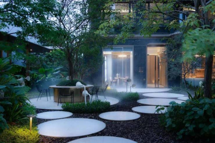 置身海语花园中,休憩卡座、种植池、汀步皆以圆形注释,赋予柔和视觉盛宴,为海居生活增添美好。
