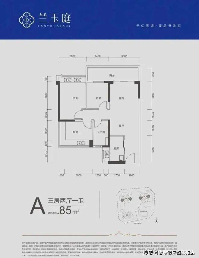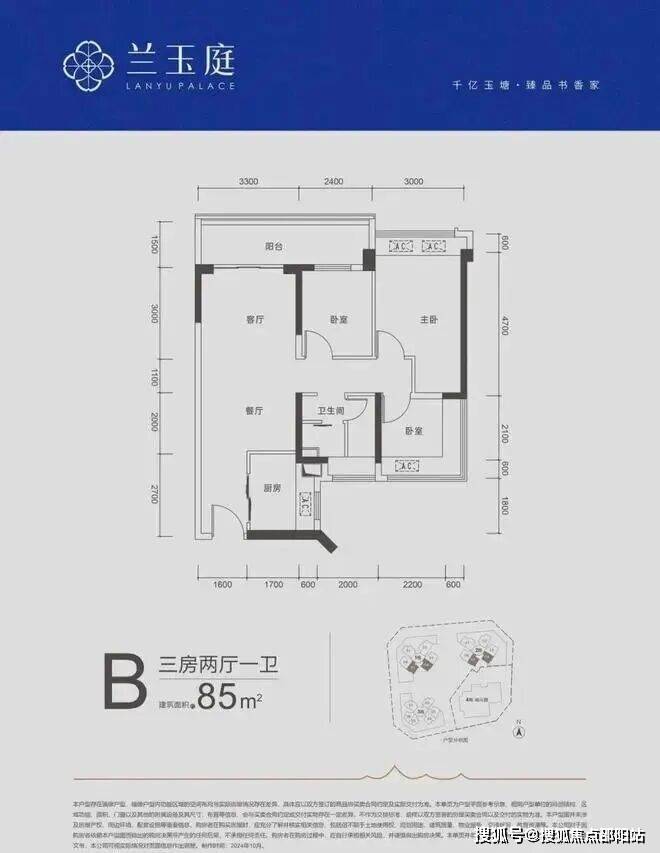 85㎡三房两厅一卫:东南和西南朝向,竖厅格局,客厅开间3.3米,客厅和次卧通阳台,约5.7米超大阳台,次卧270º飘窗,主次卧面宽分别为3米/2.8米/2.4米,得房率在90%左右(含赠送)。