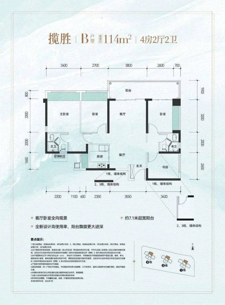 114㎡的4房2厅2卫,设计的是竖厅双龙抱珠格局,进门入户玄关,客厅3.8米的开间,LDKB一体化设计,4个卧室分别做到了3.4米/2.7米/2.6米/2.65米的宽度,客厅连接次卧出7米长的观景大阳台,U型厨房,得房率约:81.39%(不含赠送),东北朝向看科学公园。