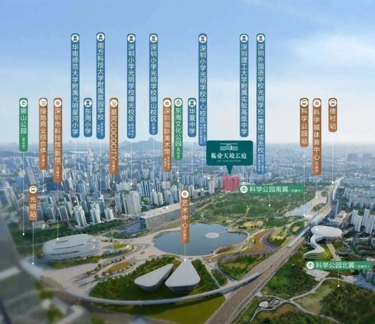 光明科学城占地约208万㎡,定位为深圳北部中心的“绿色核心”。配置有深圳国际美术馆、深圳科技馆新馆、科学城体育中心、光明文化艺术中心等市级文体配套,享深圳顶级市政配套生活。