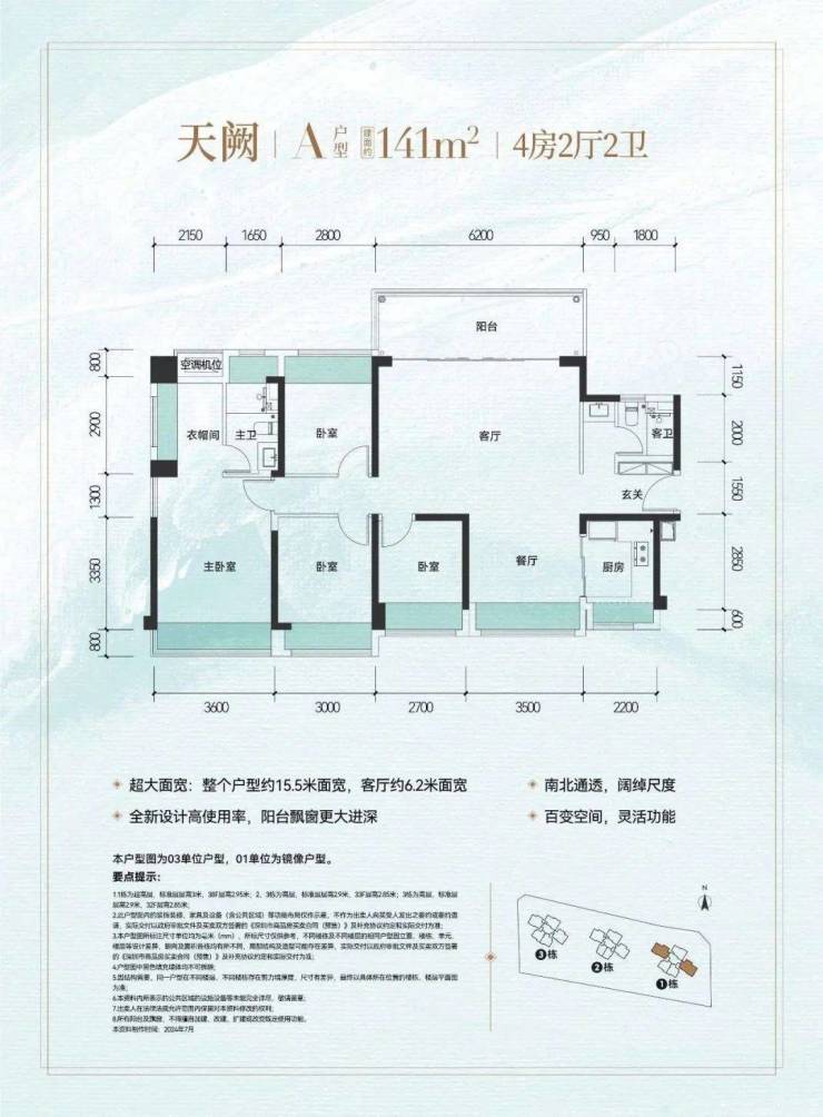 以豪宅标准打造超大户型面宽,约141㎡大四房户型,整个户型15.5米超大面宽、南北通透,客厅6.2米超大面宽,甚至具备可变“五房”的灵活空间改造潜力。