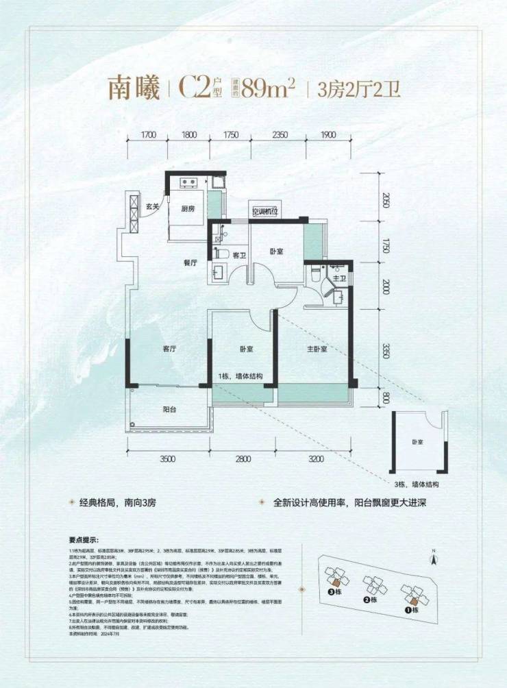 89㎡的3房2厅2卫(C1户型),设计的是经典竖厅格局,进门入户玄关,客厅3.5米开间,S墙设计预留冰箱卡槽位,三开间朝南,3个卧室分别做到了3.2米/2.8米/2.35米的宽度,U型厨房,卫生间干湿分离,得房率约:81.39%(不含赠送),西南朝向。