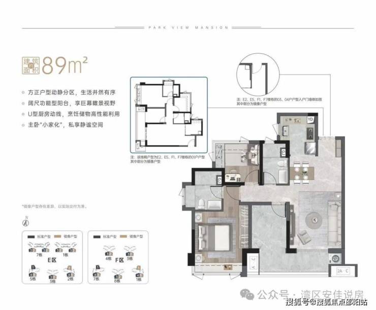 所有户型均为三开间朝南,180度全面向阳,建筑面积约89㎡/105㎡更有超大面宽阳台。