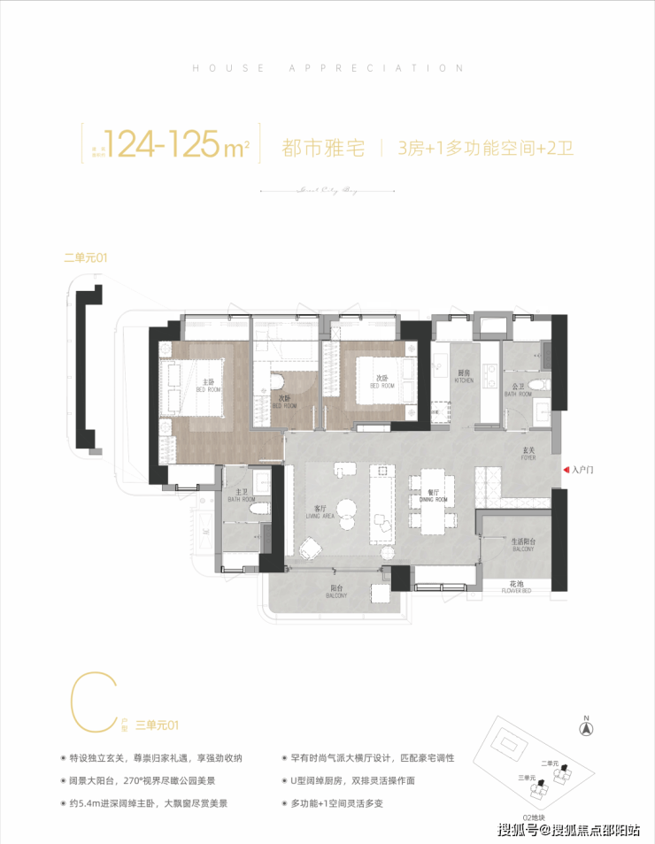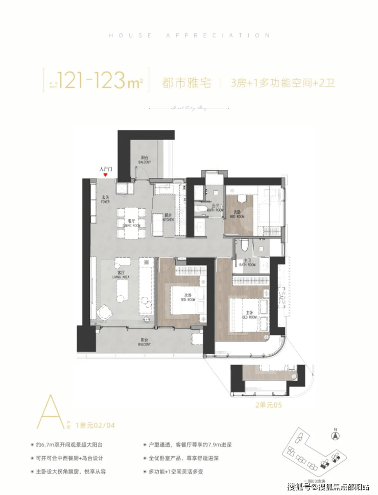 121-127㎡3+1房2厅2卫,有竖厅、横厅和双龙抱珠户型。