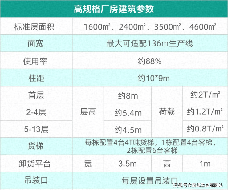 标准层面积1600-4600㎡,首层8m层高,最大可适配136m生产线,10*9m大柱距,4T货梯配置,宽3.5m、高1m卸货平台,货运通路转弯半径12m,大型货车出入无忧。