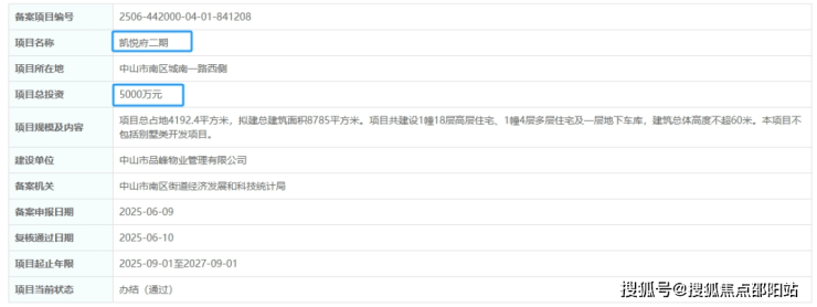 6月10日,广东省投资项目在线审批监管平台显示,项目凯悦府一期、二期正式备案。