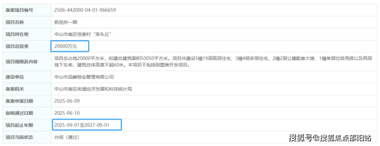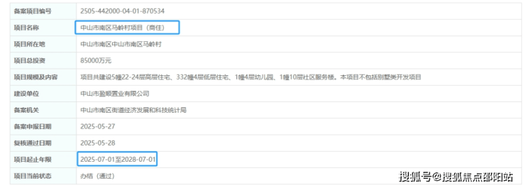 5月28日,广东省投资项目在线审批监管平台发布了中山市南区马岭村项目(商住)的备案公告。