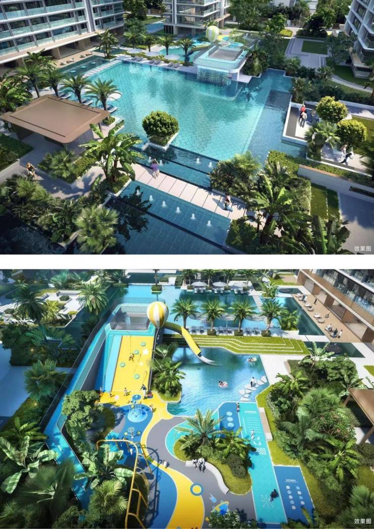 汲取曼谷四季酒店灵感,无边际泳池将奢华建筑与野奢景致自然相融,分区打造立体儿童泳池,特有的叠水景观、水上滑道、攀岩爬道等多元游乐设施,结合城市会客厅、亲水平台和水上汀步等多重景观,营造野奢型国际化度假体验。
