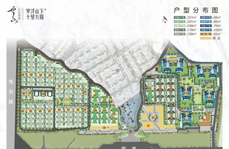 ➝二期规划:二期整体临湖排布分东西组团,建有高层洋房、公寓及叠墅、合院、商业产品。其中商业体和合荟4000+㎡,是罗浮山区域内涵盖亲子娱乐、运动健身、餐饮美食、生活配套等多元业态的高端商业体。